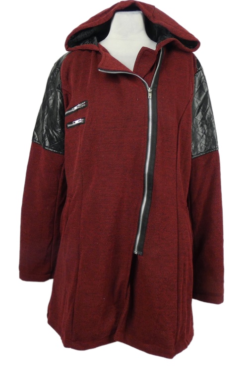 Dámsky červeno-čierny melírovnaý pletený lehce zateplený kabát s kapucňou