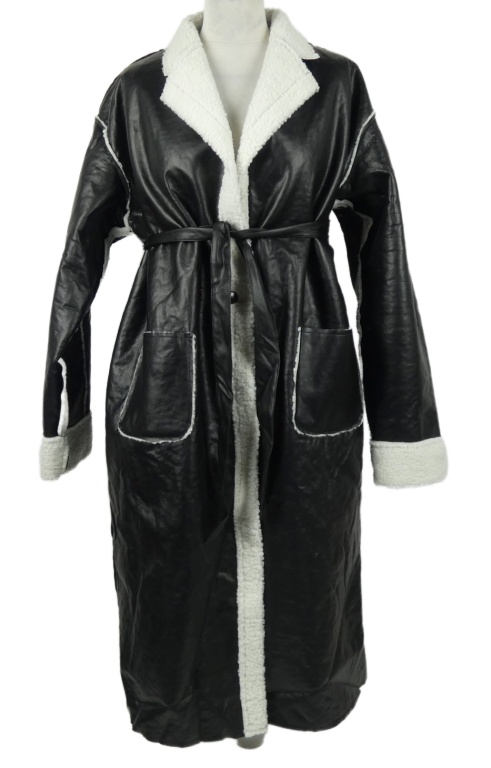 Dámsky čierny koženkový zateplený kabát s kožúškom a opaskom Shein