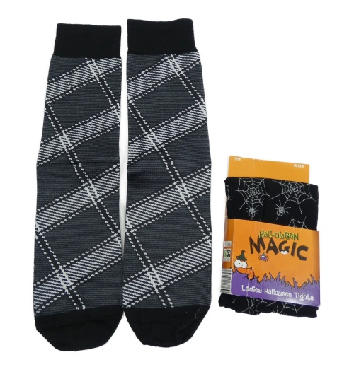 Nové - 2x Dámske sivo-čierne kárované ponožky + čierne halloweenské pančuchy