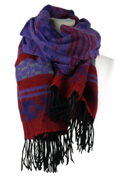 Dámska fialovo-červená vzorovaná šál s strapcemi