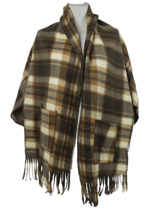 Dámský hnědo-béžový kostkovaný fleecový pléd s strapcemi