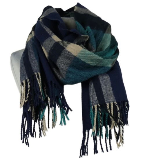 Dámska modro-tmavomodrá kockovaná šál s strapcemi