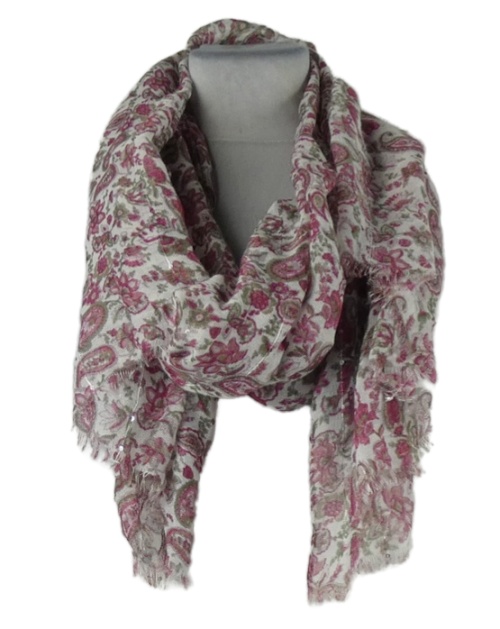 Dámska malinovo-kaki-biela vzorovaná šál s flitrami