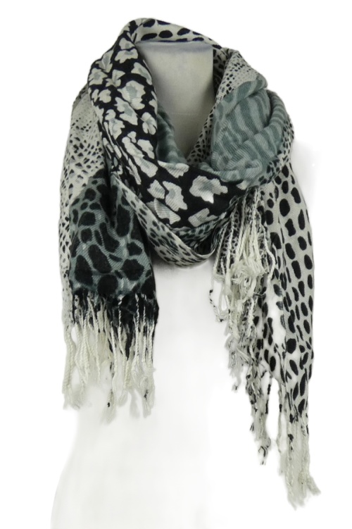 Dámska sivo-čierno-biela vzorovaná šál s strapcemi