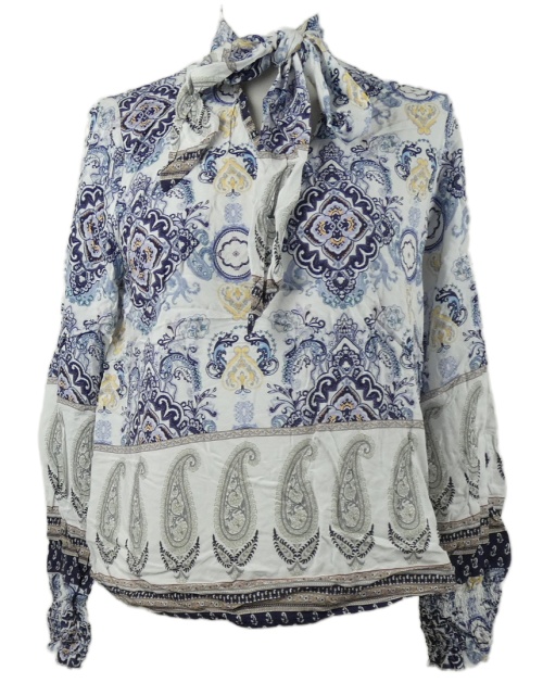 Dámska bielo-tmavomodro-béžová vzorovaná blúzka s vázačkou