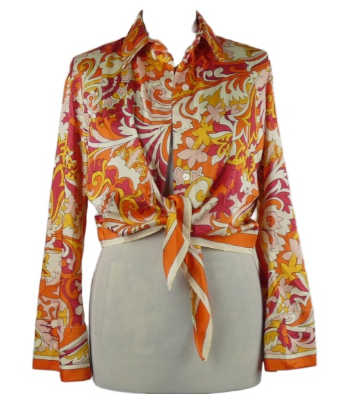 Dámska oranžovo-červeno-biela vzorovaná crop blúzka s uzlom