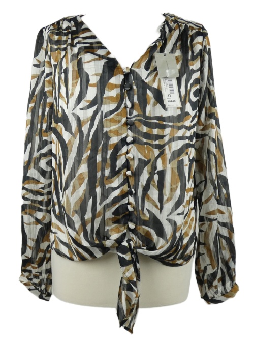 Nové - Dámska čierno-hnedo-biela vzorovaná šifónová blúzka s uzlom Roman
