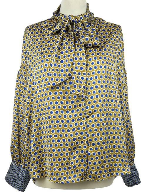 Dámska okrovo-modrá kvietkovana saténová blúzka s vázačkou