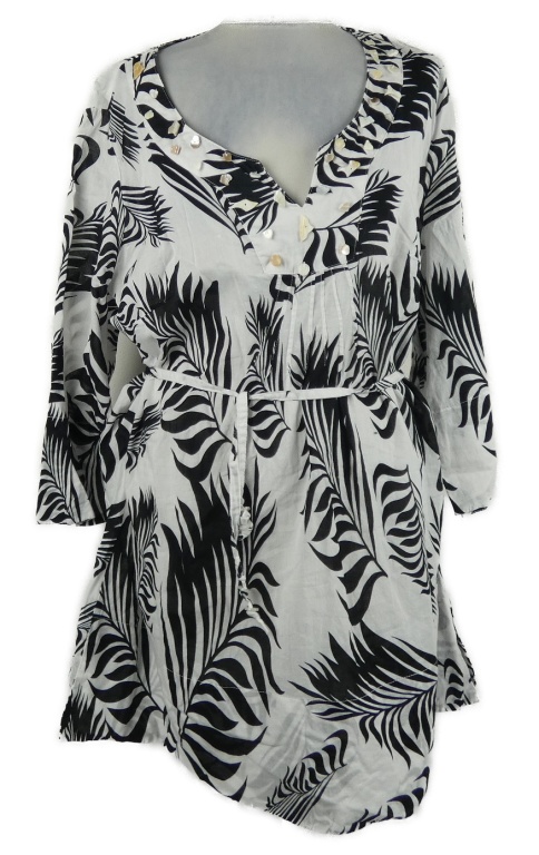 Dámska čierno-biela vzorovaná plážová tunika s provázkem v pase