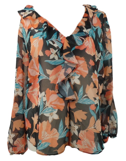 Dámska čierno-korálovo-modrá kvetovaná šifónová blúzka s volánikmi