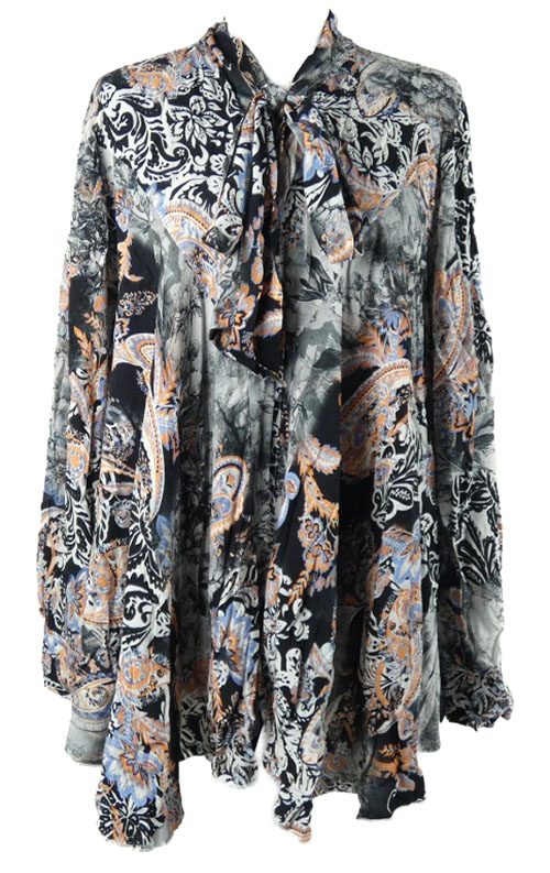 Dámska čierno-sivo-oranžová vzorovaná blúzka s mašlou