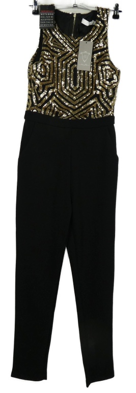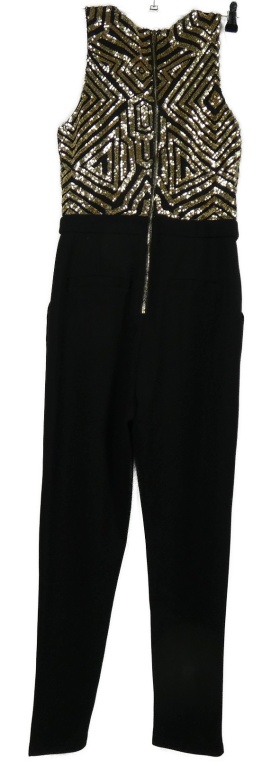 • Nové - Dámsky čierno-zlatý vzorovaný nohavicový overal s flitrovým živůtkem