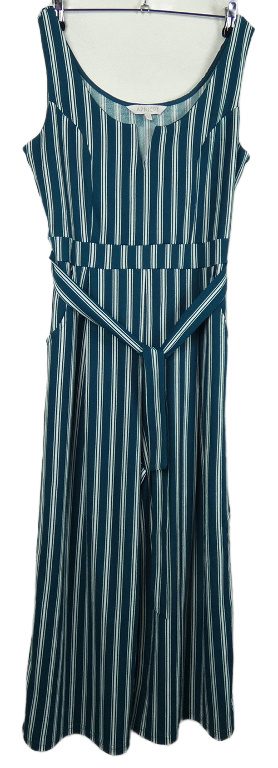 Dámsky modrozeleno-biely pruhovaný culottes nohavicový overal s opaskom Apricot