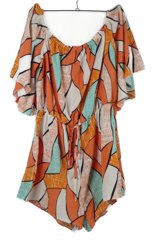 Dámsky oranžovo-modro-biely vzorovaný letný overal s lodičkovým výstřihem