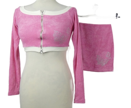 2set- Dámska ružovo-biela froté prepínaci crop mikina s motýlky + sukňa