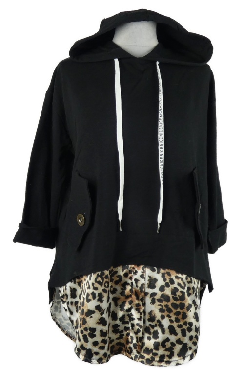 Dámska čierno-vzorovaná mikinová tunika s kapucňou