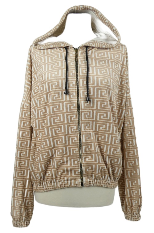 • Dámska béžovo-biela vzorovaná plyšová crop prepínaci mikina s kapucňou