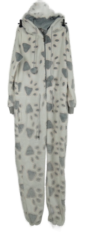 Dámska bielo-sivo-ružová vzorovaná plyšová kombinéza s kapucňou