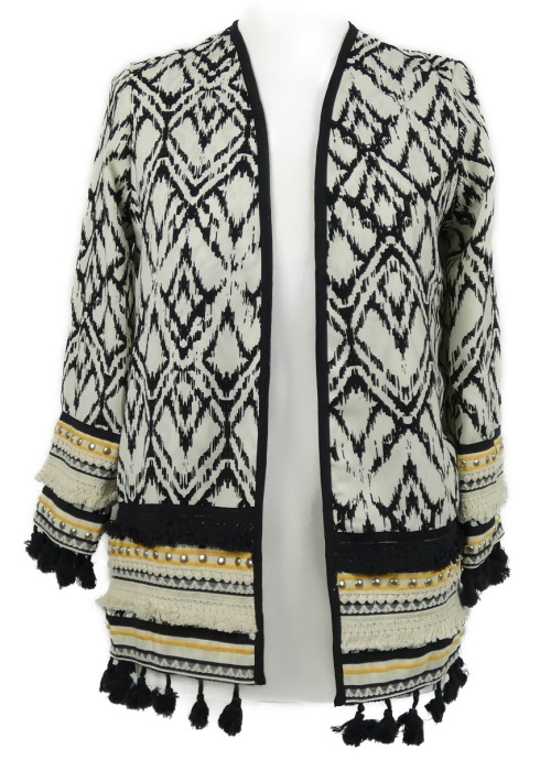 Nové - Dámsky čierno-bielo-žltý vzorovaný sakový cardigán s cvokmi a strapcemi River Island