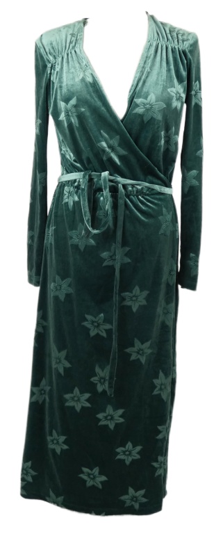 Dámske zelené kvetované zamatové zavinovací midi šaty s opaskom