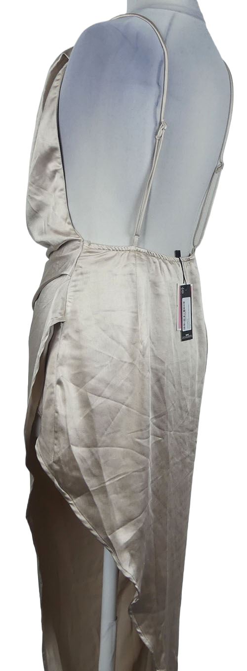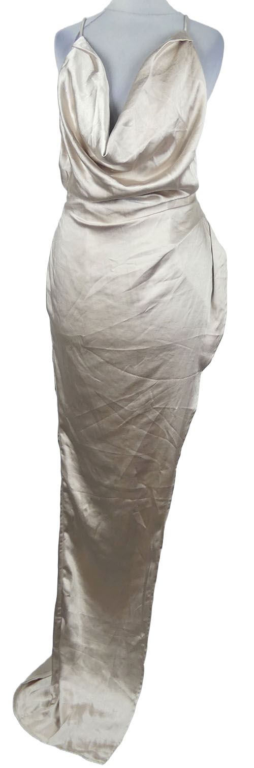 Nové - Dámske pudrové saténové dlhé šaty s vodou a rozparkem PrettyLittle Thing