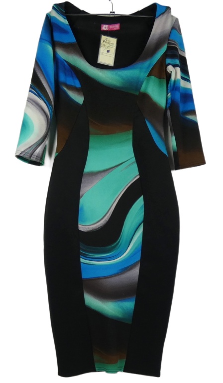 Nové - Dámske čierno-modro-zelené vzorované púzdrové šaty Goddess