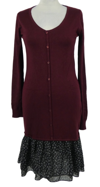 Dámske vínové svetrové šaty s černým kytičkovaným šifonovým volánem
