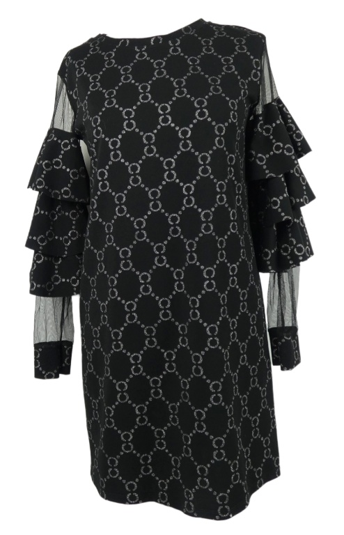 Dámske čierno-strieborné vzorované šaty s tylovými rukávy s volánikmi