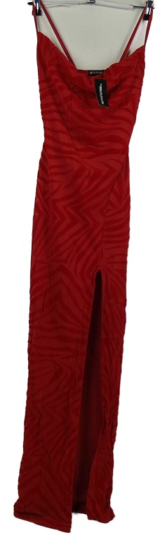 Nové - Dámske červené síťovano/sametové dlhé šaty s rozparkem PrettyLittle Thing