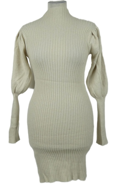 Dámske béžové rebrované svetrové šaty s nabíranými rukávy