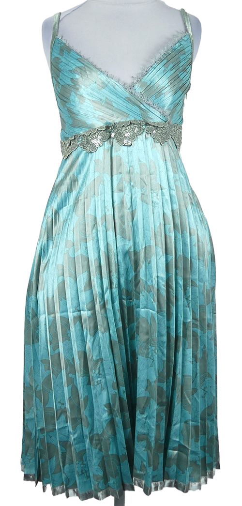 Dámske světlemodro-sivé kvetované saténové plisované koktejlové šaty s čipkou