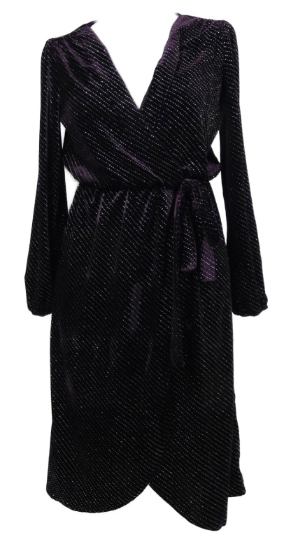 Dámske fialové trblietavé zamatové midi šaty s opaskom Voyelles