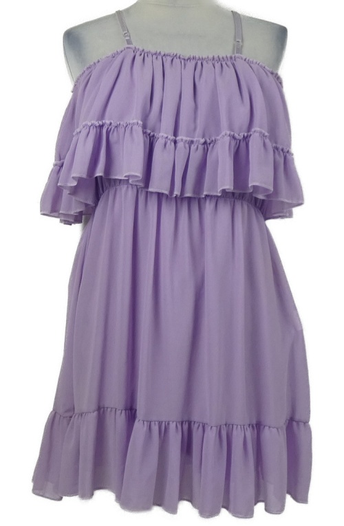 Dámske lila šifónové šaty s odhalenými rameny a volánikmi