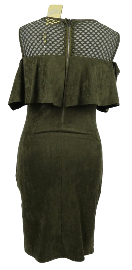 Nové - Dámske khaki semišové púzdrové šaty so síťovanými ramínky a volánikom