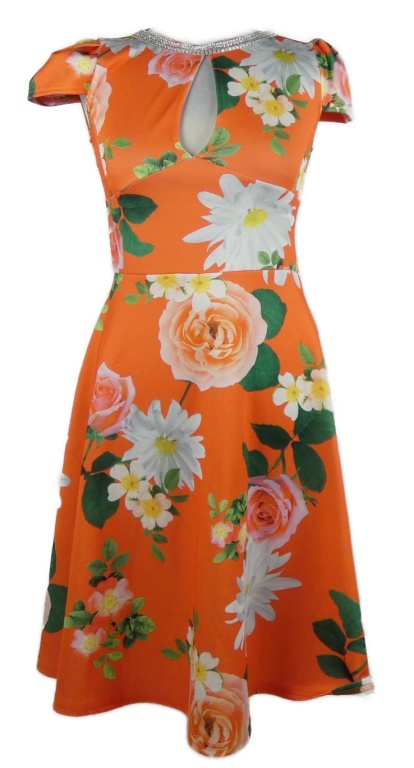 Dámske korálové kvetované šaty so štrasovým výstřihem MissLook