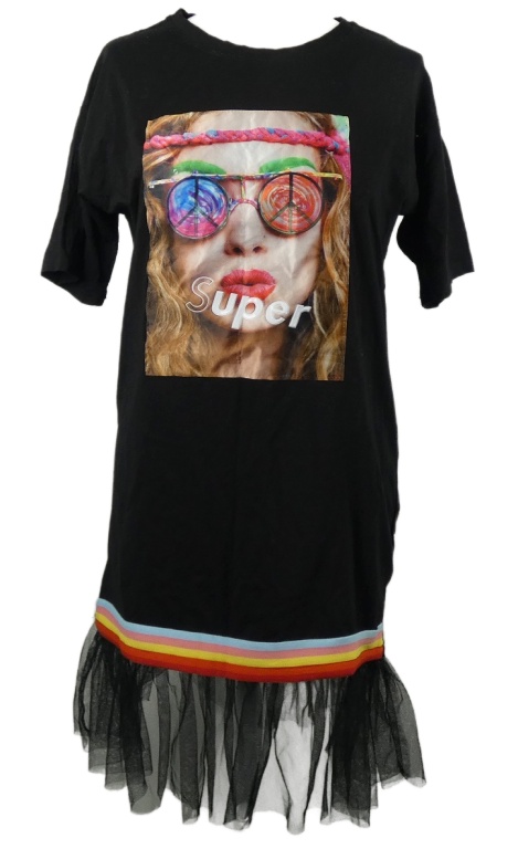 Dámske čierne šaty s potlačou a tylovým volánem