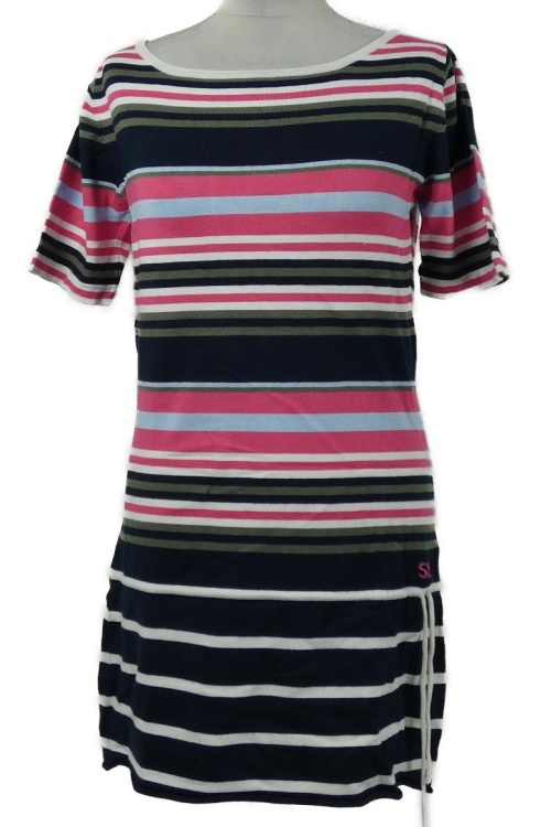 Dámske růžovo-tmavomodro-khaki pruhované pletené šaty so stahováním