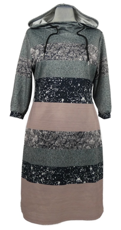 Dámske svetloružová -sivé pruhované šaty so vzorom a kapucňou