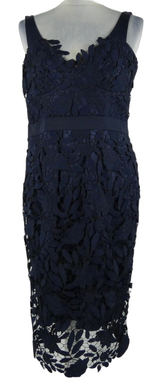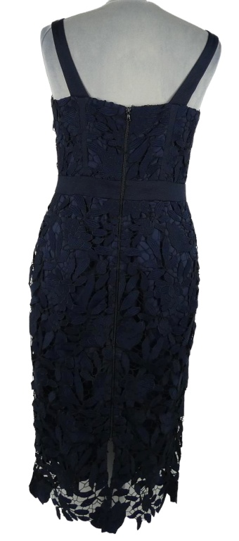 Dámske tmavomodré čipkové midi púzdrové šaty Damsel