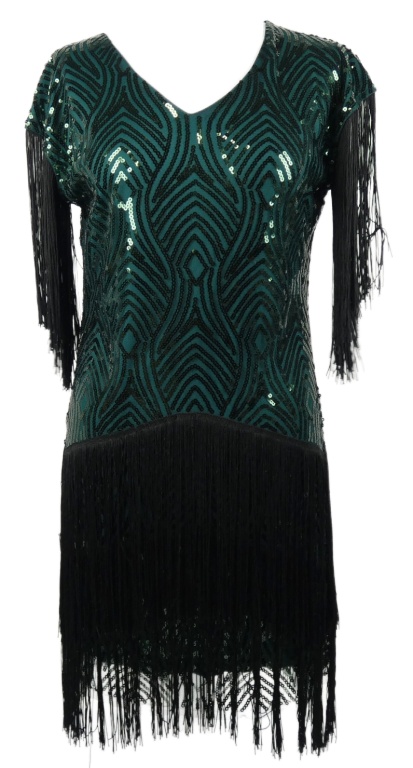 Dámske tmavozeleno-čierne flitrové šaty s strapcemi