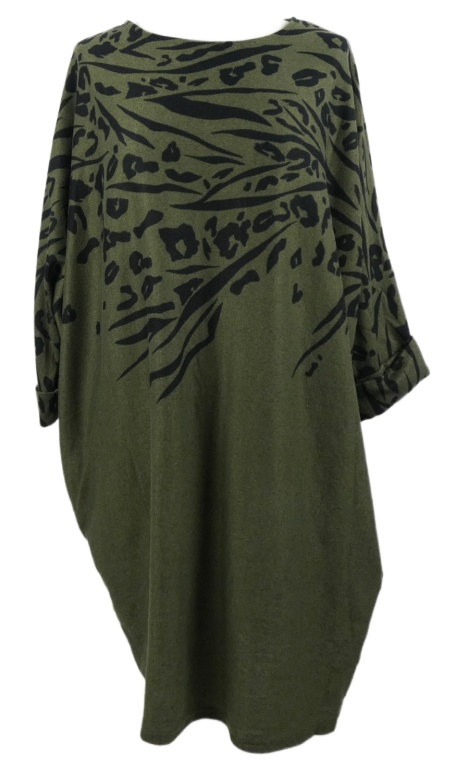Dámske kaki-čierne vzorované svetrové voľné é šaty