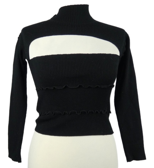 • Dámsky čierny rebrovaný crop sveter s prestrihom a stojačikom Shein