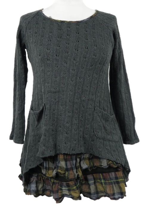 Dámska sivo-kockovaná svetrová tunika s volánikmi