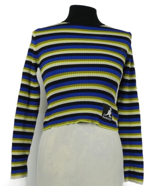 • Dámsky modro-žlto-čierny pruhovaný rebrovaný crop sveter so stojačikom Kangol