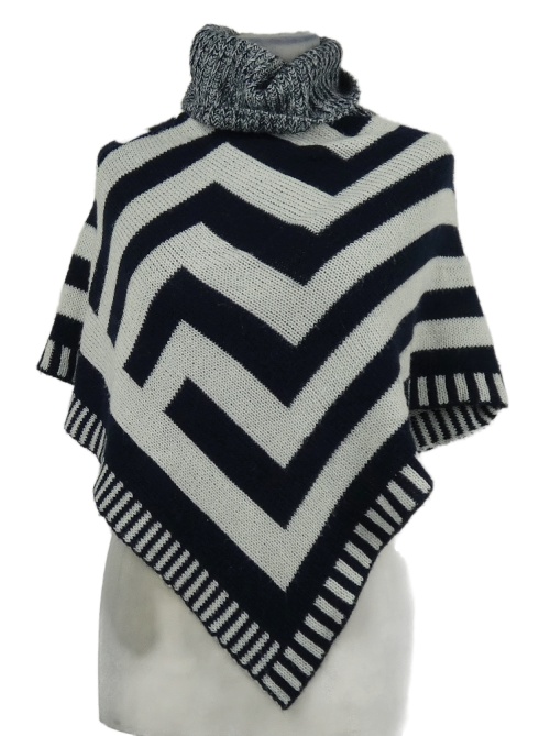 Dámske bielo-tmavomodré pruhované svetrové pončo s rolákom