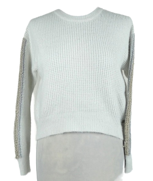 Dámsky biely chlpatý crop sveter s pruhmi Ikss