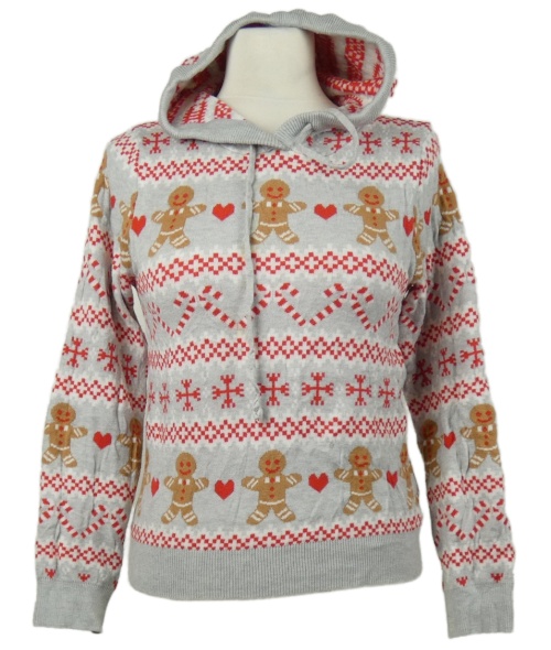 • Dámsky sivo-červený vzorovaný sveter s perníčky a kapucňou Primark
