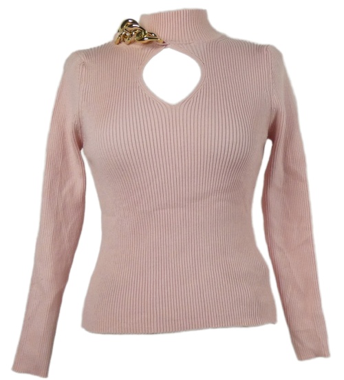 • Dámsky svetloružový rebrovaný sveter s prestrihom a retiazkou Cameo Rose