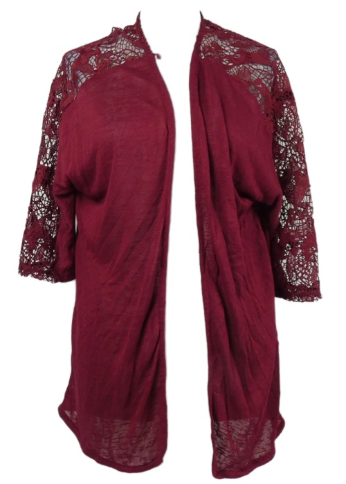 Dámsky vínový úpletový cardigán s čipkou Klass
