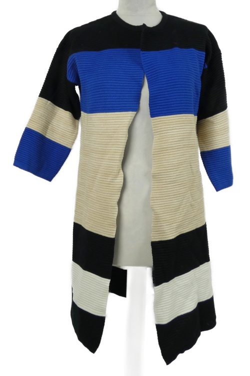 Dámsky čierno-modro-béžový pruhovaný svetrový cardigán